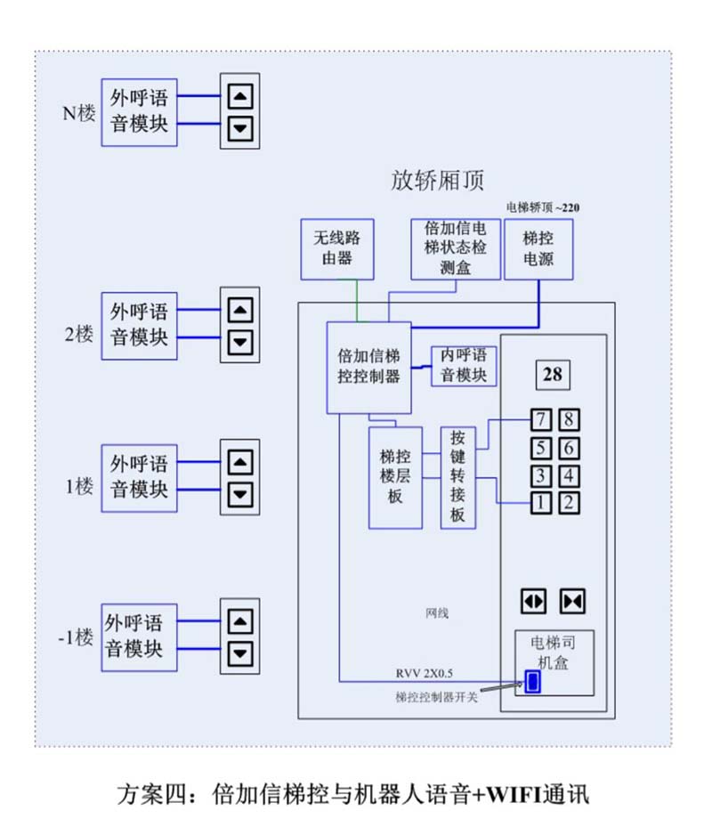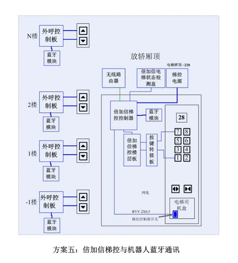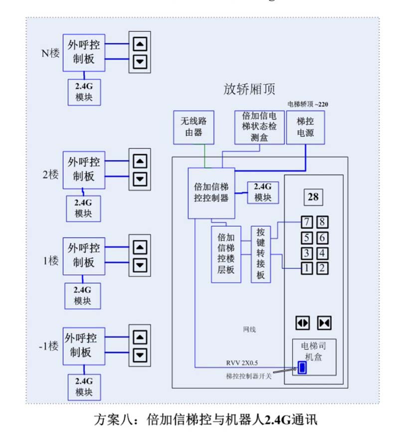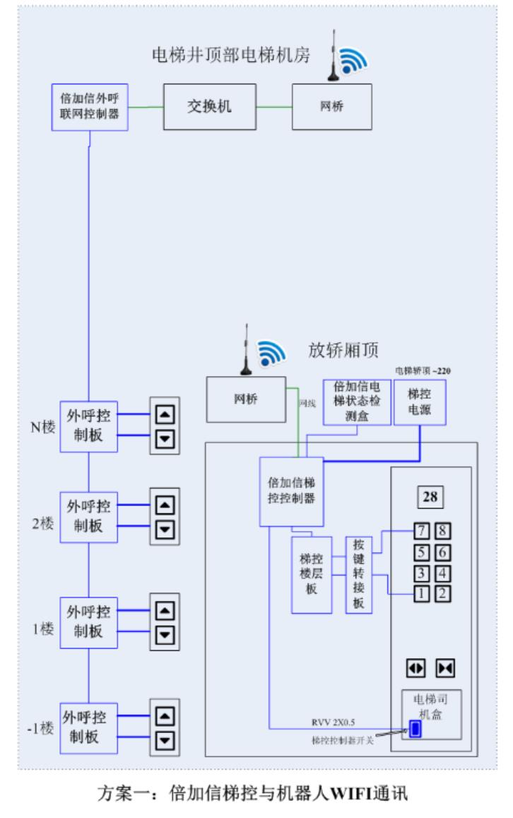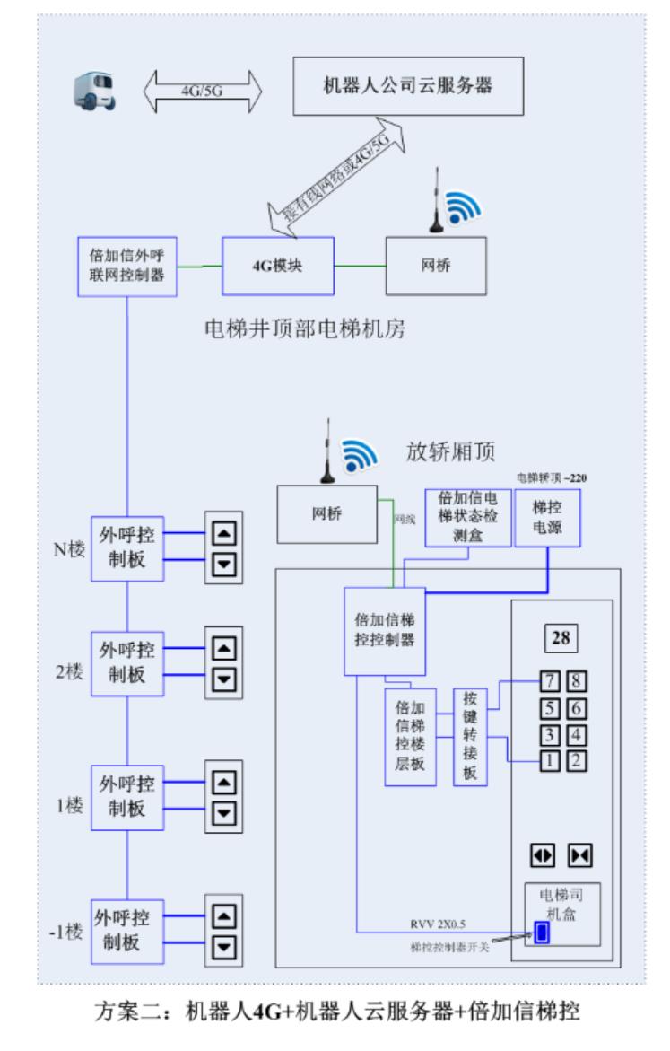 (1)機器人在電梯外,通個Wifi或4G網絡發送指令給倍加信梯控平臺,倍加信梯控云平臺收到指令后,將指令發給倍加信梯控系統,倍加信梯控系統自動點亮上樓或下樓按鍵,實現呼梯功能。