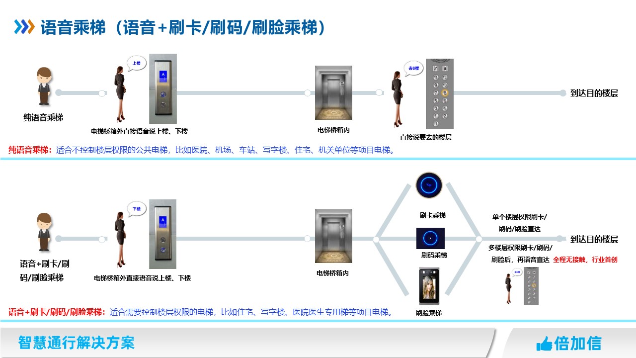 倍加信科技作為專業的梯控系統研發廠家,推出真正零接觸的乘梯方案。不判斷樓層權限,全程通過語音識別實現呼梯和乘梯。