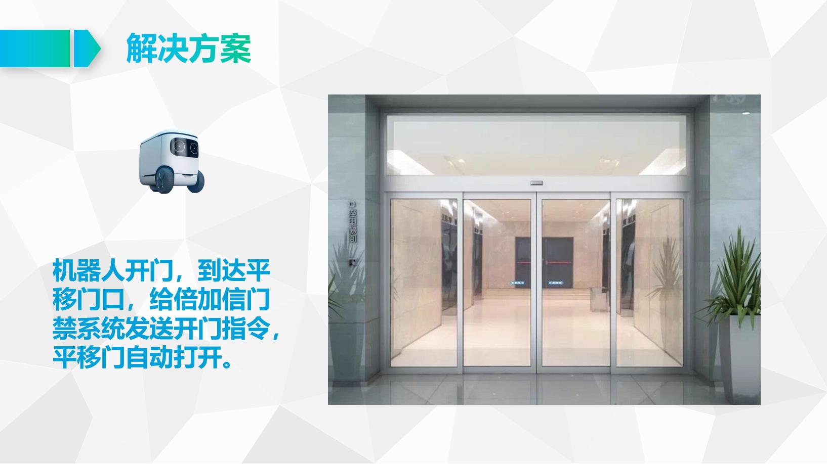 機器人開門,到達平移門口,給倍加信門禁系統發送開門指令,平移門自動打開。