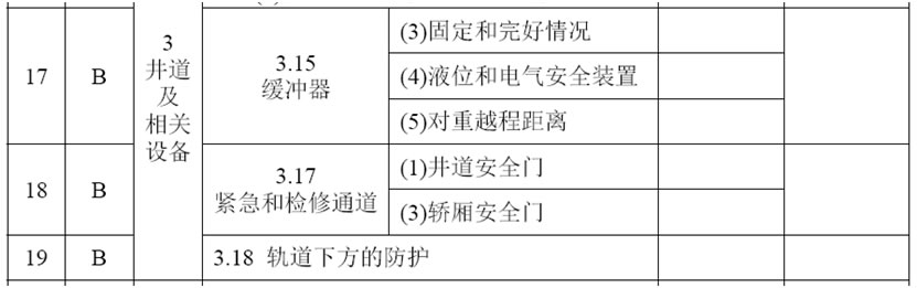 (17)增加3.18項,項目及類別為:“軌道下方的防護 B”,檢驗內容與要求為:“如果人員可以進入電梯運行軌道的下方,應當設置無孔的防護隔障,以擋住和收納可能從斜行電梯上掉落的碎片或者零件”;