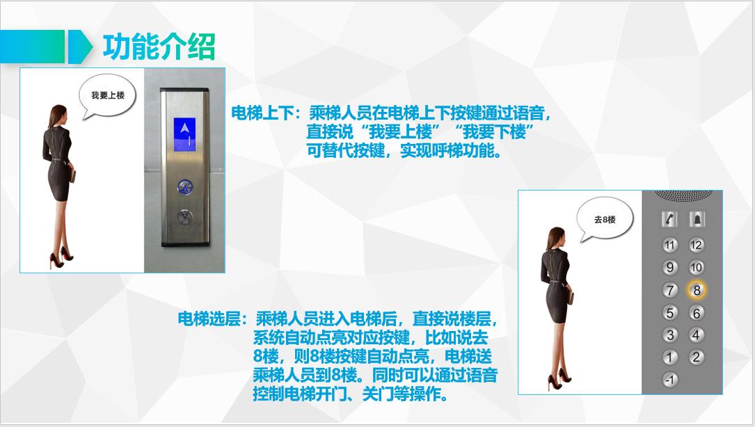 (1)語音呼梯:電梯外上下按鍵面板后面裝語音識別模塊,一層一個,安裝,如果面板密閉性強需要打一個小孔聲音能傳進去即可,語音識別有限,輸出點亮按鍵信號,取電12V或者24V都可以,直接從按鍵后面板上取電,然后兩路輸出分別接上下按鍵;