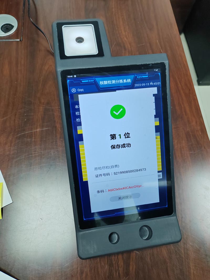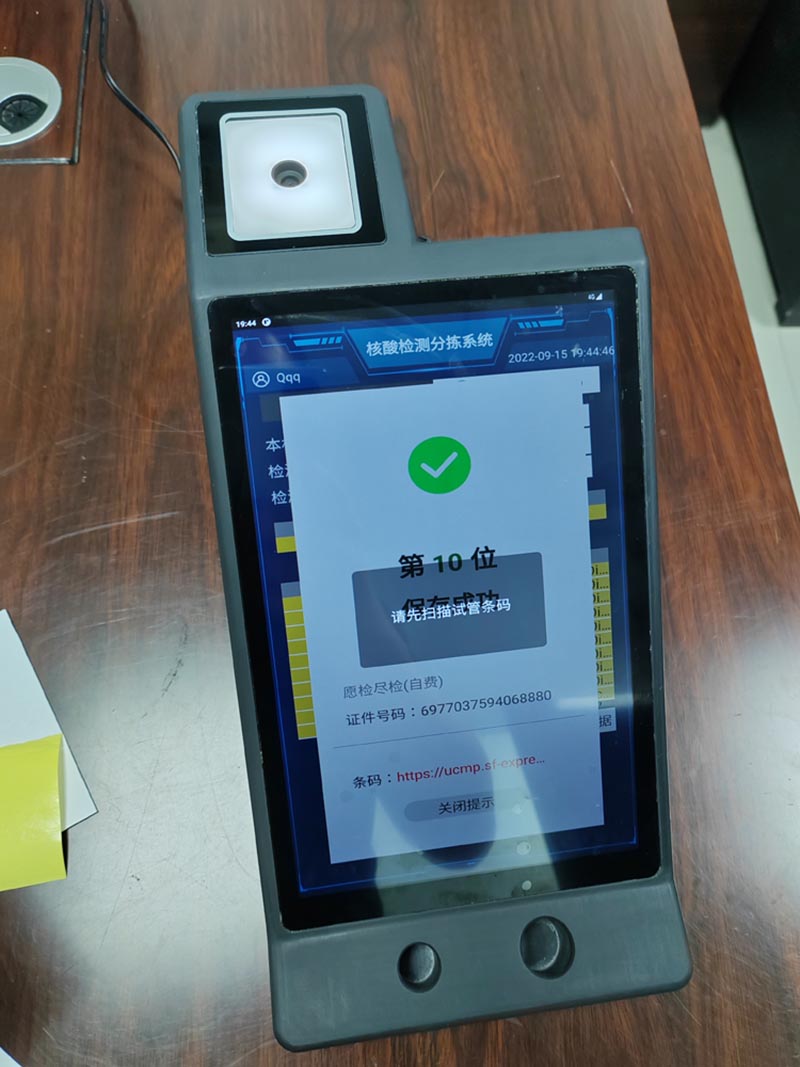 5、依次進行,滿了5人或者10人或者20人后,系統提示掃試管碼,同時上報數據給衛健委平臺;