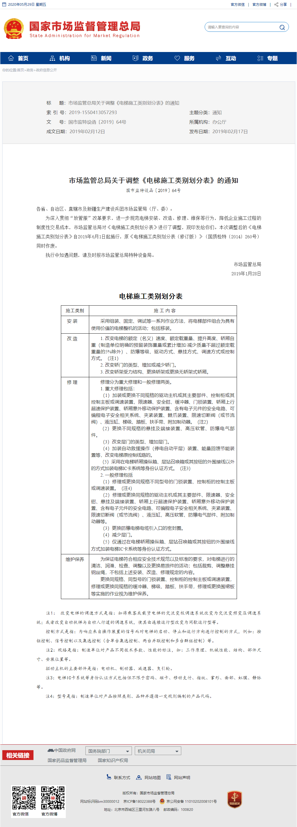 《電梯施工類別劃分表》市場監(jiān)管總局-國市監(jiān)特設(shè)函〔2019〕64號