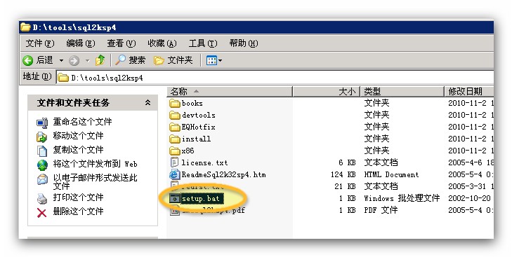 解壓sql2ksp4.rar這個壓縮包到當(dāng)前路徑,點擊setup.bat進(jìn)行安裝,注意很多人把解壓當(dāng)成安裝,解壓了并不是安裝,一定要注意,解壓后需要到解壓目錄下執(zhí)行安裝。